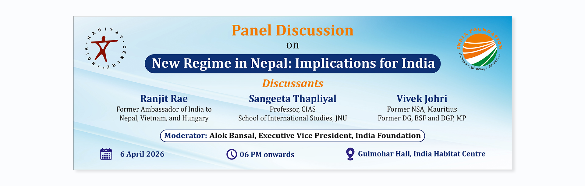 Panel Discussion on New Regime in Nepal: Implications for India. Discussants: Ranjit Rae, former Ambassador of India to Nepal, Vietnam, and Hungary; Sangeeta Thapliyal, Professor, CIAS - School of International Studies, JNU; Vivek Johri, former NSA - Mauritius, former DG, BSF, and DGP, MP. The session will be moderated by Alok Bansal, Executive Vice President, India Foundation. Collab. India Foundation.