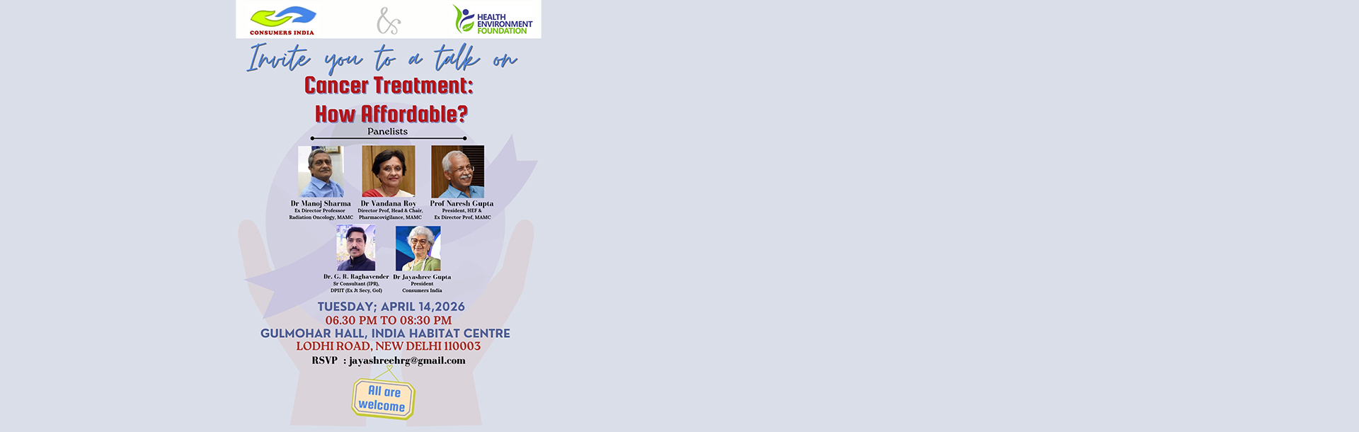 Consumer Series. Cancer Treatment: How Affordable? Panelists: Dr. Manoj Sharma, former Director Professor, Radiation Oncology, Maulana Azad Medical College; Dr. Vandana Roy, Director, Professor & Head, Dept. of Pharmacology, Chair - Pharmacovigilance, Maulana Azad Medical College; Prof. Naresh Gupta, President - HEF, former Director - Professor, Maulana Azad Medical College; Dr. G. R. Raghavender, Senior Consultant (IPR), DPIIT (retd. Joint Secretary, Govt. of India); Dr. Jayashree Gupta, President, Consumers India. Collab. Consumers India and HEF.