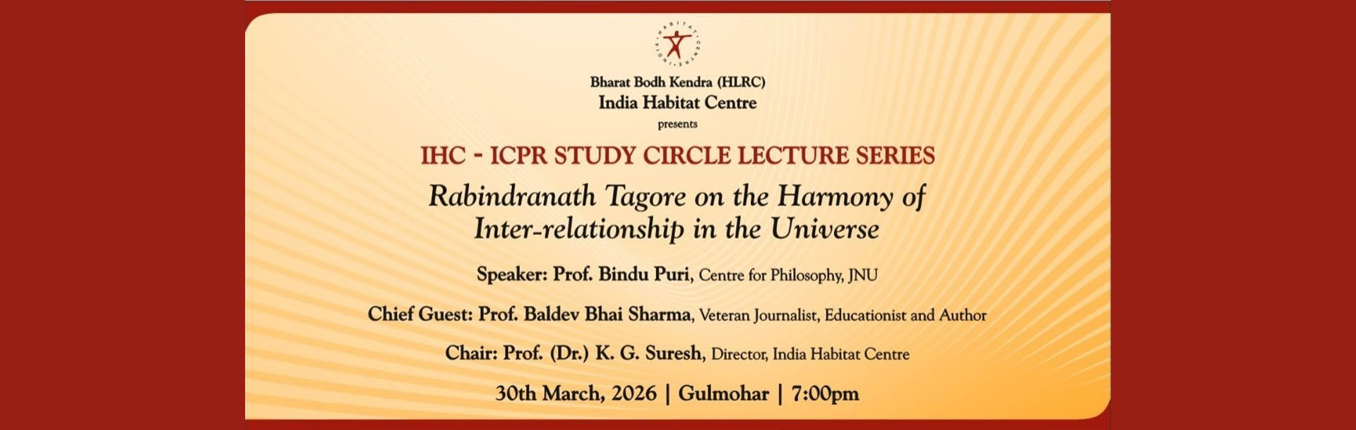 IHC - ICPR Study Circle, Lecture Series. Presented by the Bharat Bodh Kendra, Habitat Library & Research Centre. Rabindranath Tagore on the Harmony of Inter-relationship in the Universe. Speaker: Prof. Bindu Puri, Centre for Philosophy, JNU. Chief Guest: Prof. Baldev Bhai Sharma, Veteran Journalist, Educationist and Author. Chair: Prof. (Dr.) K. G. Suresh, Director, IHC.