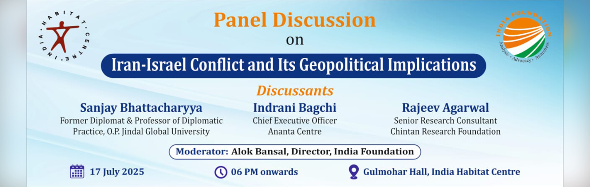 Panel Discussion on Israel-Iran Conflagration and Its Geopolitical Implications. Panelists: Prof. Sanjay Bhattacharyya, Former Diplomat & Professor of Diplomatic Practice, O.P. Jindal Global University; Indrani Bagchi, Chief Executive Officer, Ananta Centre; & Col. Rajeev Agarwal, Senior Research Consultant, Chintan Research Foundation. The session will be moderated by Capt. Alok Bansal, Director, India Foundation. Collab. India Foundation.