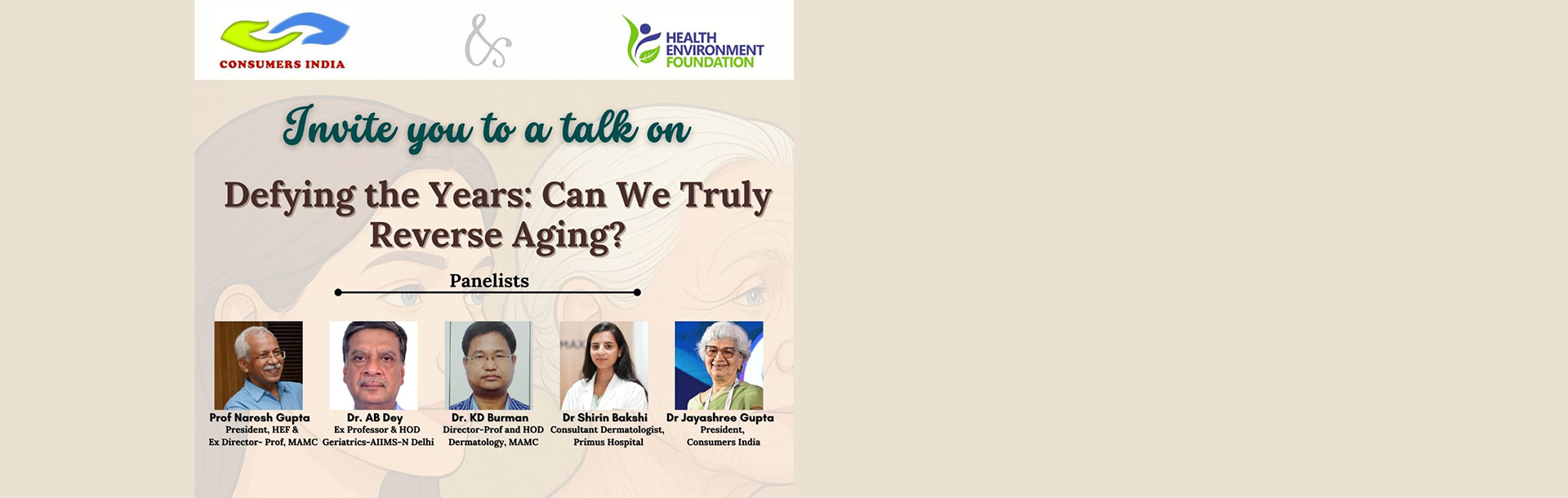 Consumer Series. Defying the Years: Can We Truly Reverse Aging? Panelists: Prof. Naresh Gupta, President, HEF & former Director-Professor, Maulana Azad Medical College, Delhi; Dr. AB Dey, former Professor and HOD Geriatrics Deptt., AIIMS-New Delhi; Dr. KD Burman, Director-Professor, HOD Dermatology, MAMC and LNH-Delhi; Dr. Shirin Bakshi, Consultant Dermatologist, DermaSure Skin & Hair Clinic, Visiting Consultant at Primus Hospital & Max Smart, Saket and Dr. Jayashree Gupta, President, Consumers India. Collab. Consumers India and HEF.