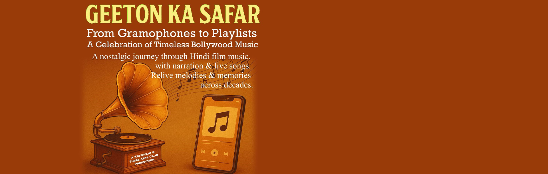 Geeton Ka Safar: From Gramophones to Playlists. A Celebration of Timeless Bollywood Music. With narration and live singing, the show celebrates timeless songs that reflect the changing eras. Each decade brings a new emotion, a new melody and a shared memory. Live Singing: Devanand Jha & Anjila Gugnani. Narration: Nidhikant Pandey. Produced by Sohaila Kapur and Anuradha Dar. Prod. Katyayani and Three Arts Club.