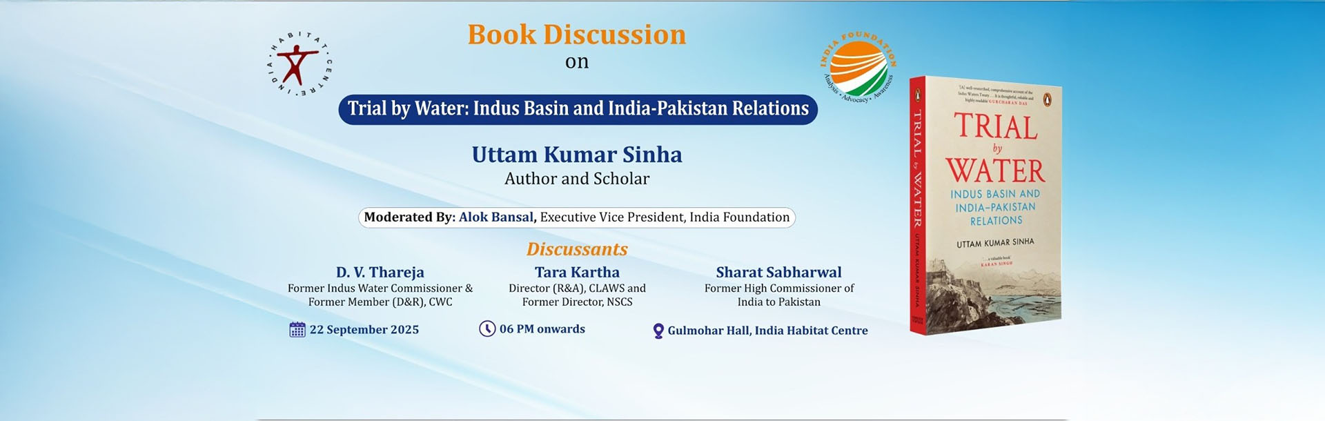 Book Discussion on Trial by Water: Indus Basin and India-Pakistan Relations by Uttam Kumar Sinha, author and scholar. Discussants: D. V. Thareja, former Indus Water Commissioner & former member (D&R), CWC; Tarat Kartha, Director (R&A), CLAWS, and former Director, NSCS; Sharat Sabharwal, former High Commissioner of India to Pakistan. The session will be moderated by Alok Bansal, Executive Vice President, India Foundation. Collab. India Foundation.