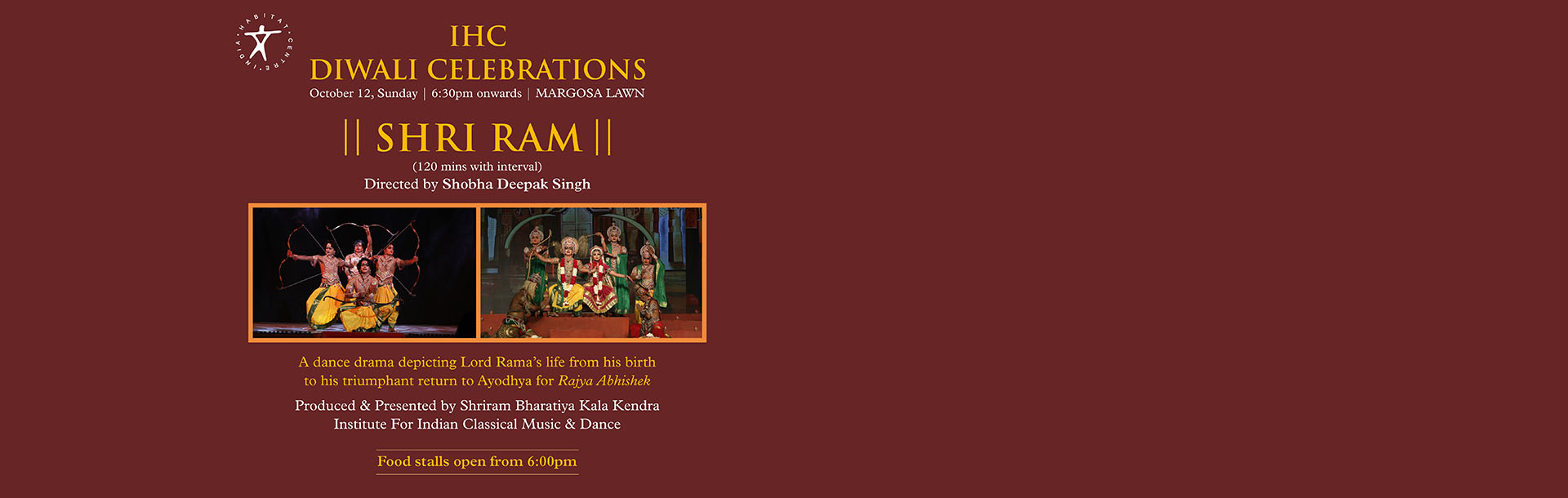IHC Diwali Celebrations. Shri Ram (120 mins with interval). Directed by Shobha Deepak Singh. A dance drama depicting Lord Rama’s life from his birth to his triumphant return to Ayodhya for Rajya Abhishek. Produced & presented by Shriram Bharatiya Kala Kendra, Institute For Indian Classical Music & Dance. Venue: Margosa Lawn. Food Stalls open from 6.00 pm. ENTRY FREE AND OPEN TO ALL. Venue: Margosa Lawn.