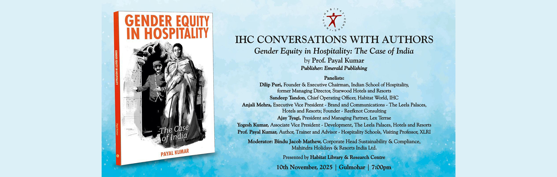 IHC CONVERSATIONS WITH AUTHORS. Presented by the Habitat Library & Research Centre. Gender Equity in Hospitality: The Case of India by Prof. Payal Kumar. Publisher: Emerald Publishing. The book showcases the barriers, both systemic and individual, to women leadership in the hospitality sector in India, while also highlighting HR policies, such as flexi-timing, that have successfully benefitted women in hospitality, and which have the potential to serve as future models for implementing systemic change. Panelists: Dilip Puri, Founder & Executive Chairman, Indian School of Hospitality, former Managing Director, Starwood Hotels and Resorts; Sandeep Tandon, Chief Operating Officer, Habitat World, IHC; Anjali Mehra, Executive Vice President - Brand and Communications - The Leela Palaces, Hotels and Resorts; Founder - Reefknot Consulting; Ajay Tyagi, President and Managing Partner, Lex Terrae; Yogesh Kumar, Associate Vice President - Development, The Leela Palaces, Hotels and Resorts; Prof. Payal Kumar, Author, trainer and Advisor - Hospitality Schools, Visiting Professor, XLRI. Moderator: Bindu Jacob Mathew, Corporate Head Sustainability & Compliance, Mahindra Holidays & Resorts India Ltd.