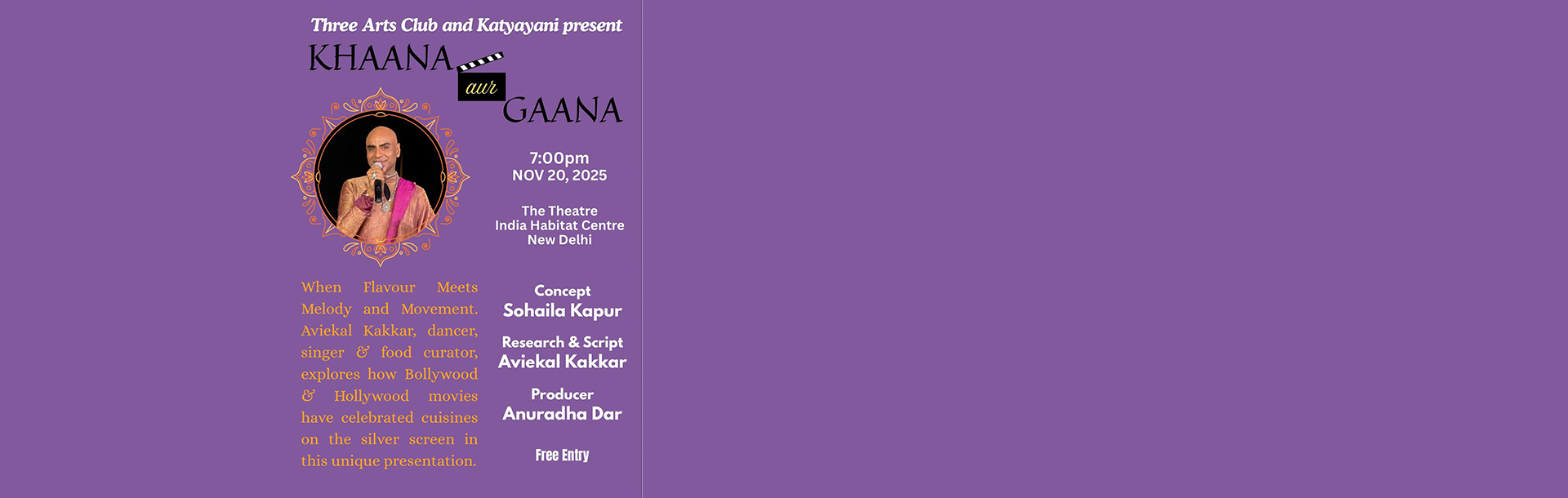 Khaana aur Gaana. When Flavour Meets Melody and Movement. Aviekal Kakkar, dancer, singer and food curator, explores how Bollywood and Hollywood movies have celebrated cuisines on the silver screen in this unique presentation. Conceived by Sohaila Kapur. Written, presented & directed by Aviekal Kakkar. Produced by Anuradha Dar. Prod. Three Arts Club and Katyayani.