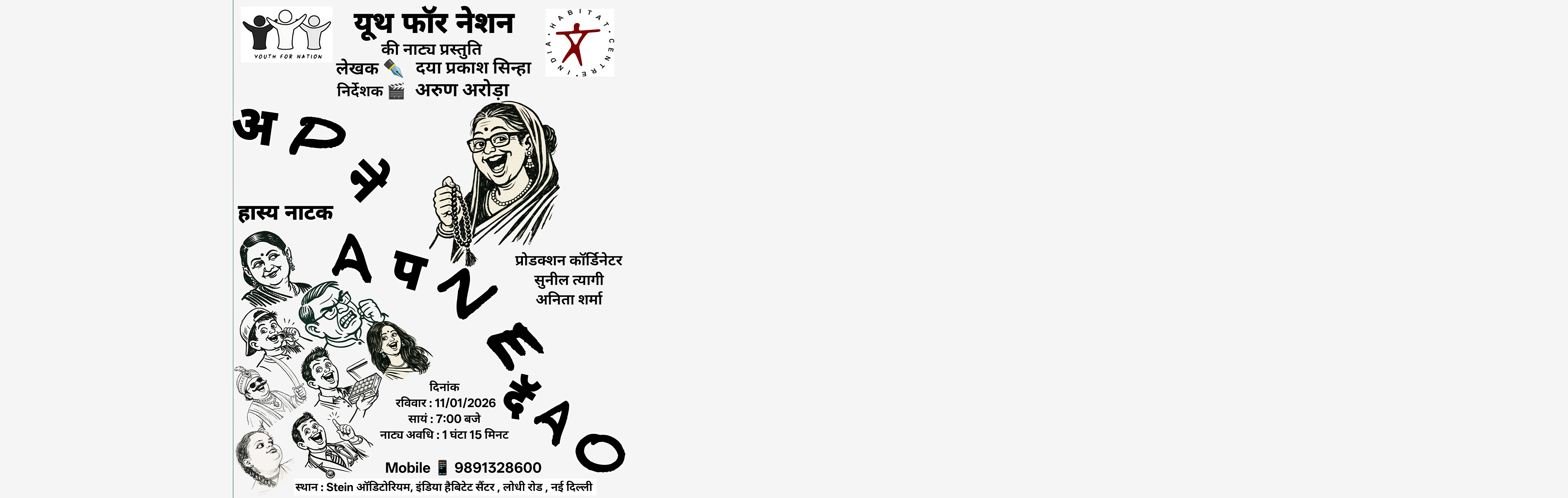 Apne Apne Daon (Hindi/ 65 mins) Wri. Daya Prakash Sinha. Dir. Arun Arora. A light-hearted play about a middle-class family where each member juggles selfish desires under the guise of caring for their elderly relative. Through comic situations and witty dialogue, the play highlights how greed and personal ambitions affect relationships. Prod. Youth For Nation